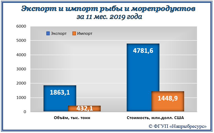 За январь-ноябрь 2019 года объем экспорта рыбы и морепродуктов (группа 03 ТН ВЭД) по сравнению с аналогичным периодом 2018 года сократился на 9,0%, а его стоимость возросла на 1,9%. Средние контрактные цены по основной позиции экспорта, мороженой рыбе, уменьшились на 1,2%.
