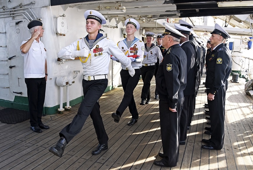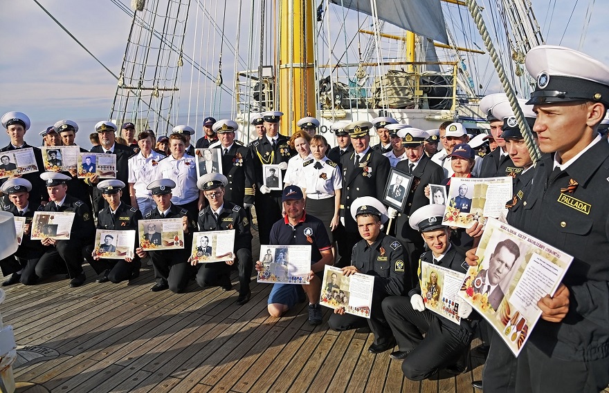 После подъема флага и знамени Победы на борту состоялась акция «Бессмертный полк» – курсанты и экипаж вышли на палубу с портретами родных и близких, которые воевали и трудились для Победы в Великой Отечественной войне. Как отметил капитан, у «Паллады» большой опыт участия в акции «Бессмертный полк» за рубежом, особенно в Китае и Южной Корее.