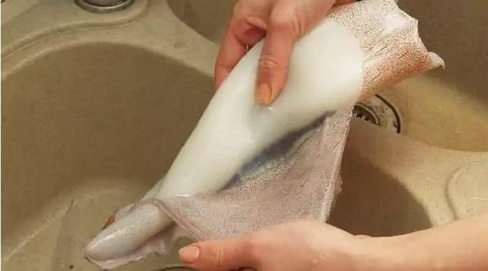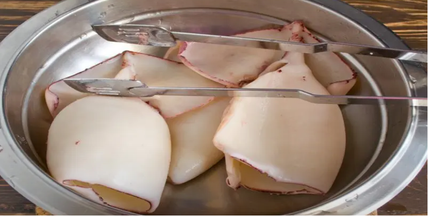 - Очистите аккуратно их, снимите кожу снаружи и внутри, тщательно промойте. Проще всего очистить продукт, пока он не полностью разморозился. Удалите твёрдую пластинку, если увидите ее внутри.