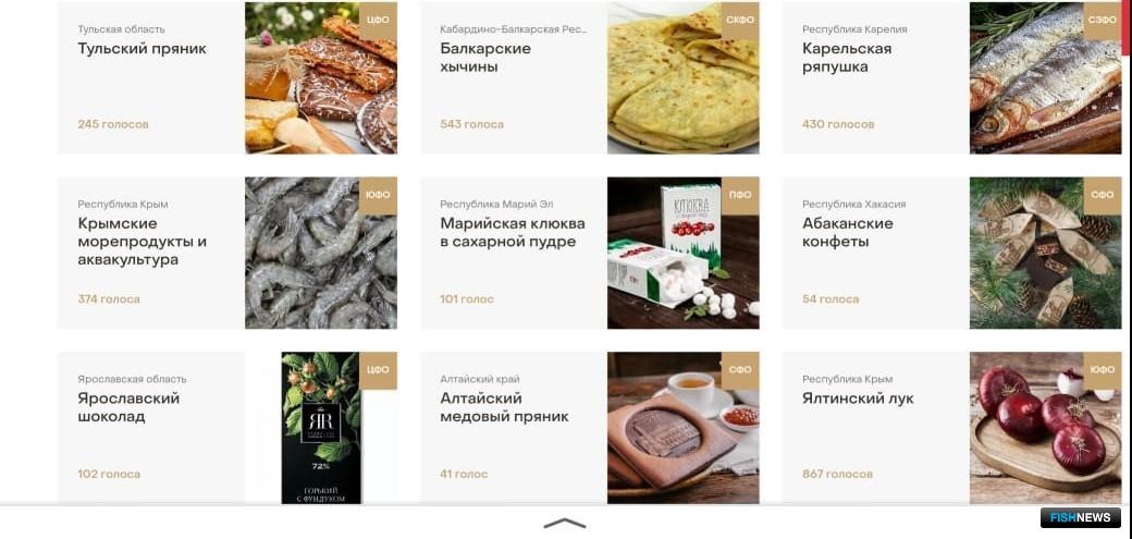 Лучшие региональные бренды можно выбрать в рамках онлайн-голосования в конкурсе «Вкусы России». Среди участников широко представлена рыба - олюторская сельдь, карельская форель, астраханская вобла и многое другое.