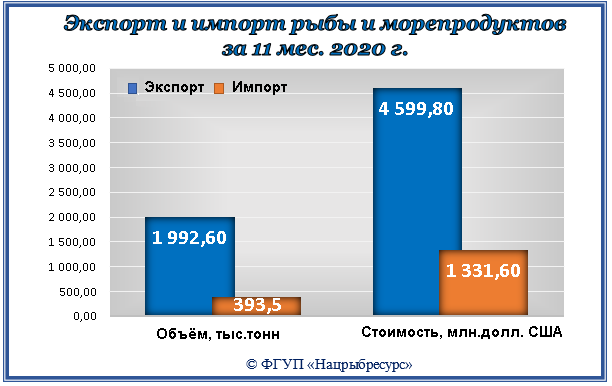 За январь-ноябрь 2020 г. объем экспорта рыбы и морепродуктов (группа 03 ТН ВЭД) по сравнению с аналогичным периодом 2019 г. увеличился на 4,3%, а его стоимость снизилась на 5,5%. Средние контрактные цены по основной позиции экспорта – мороженой рыбе, уменьшились на 10,9%.