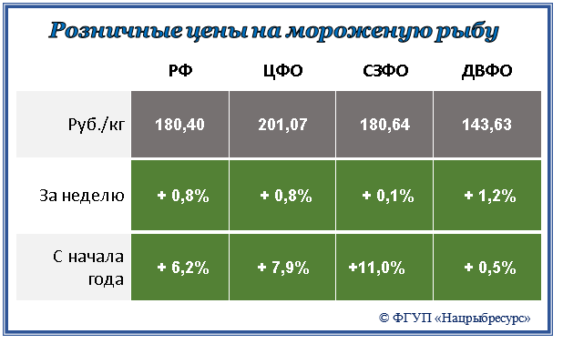 Розничные цены продолжают демонстрировать повышенные темпы роста. В период с 15 по 21 декабря т.г. средний уровень потребительских цен на рыбу мороженую неразделанную возрос на 0,8%. По сравнению с началом года цены увеличились на 6,2%.