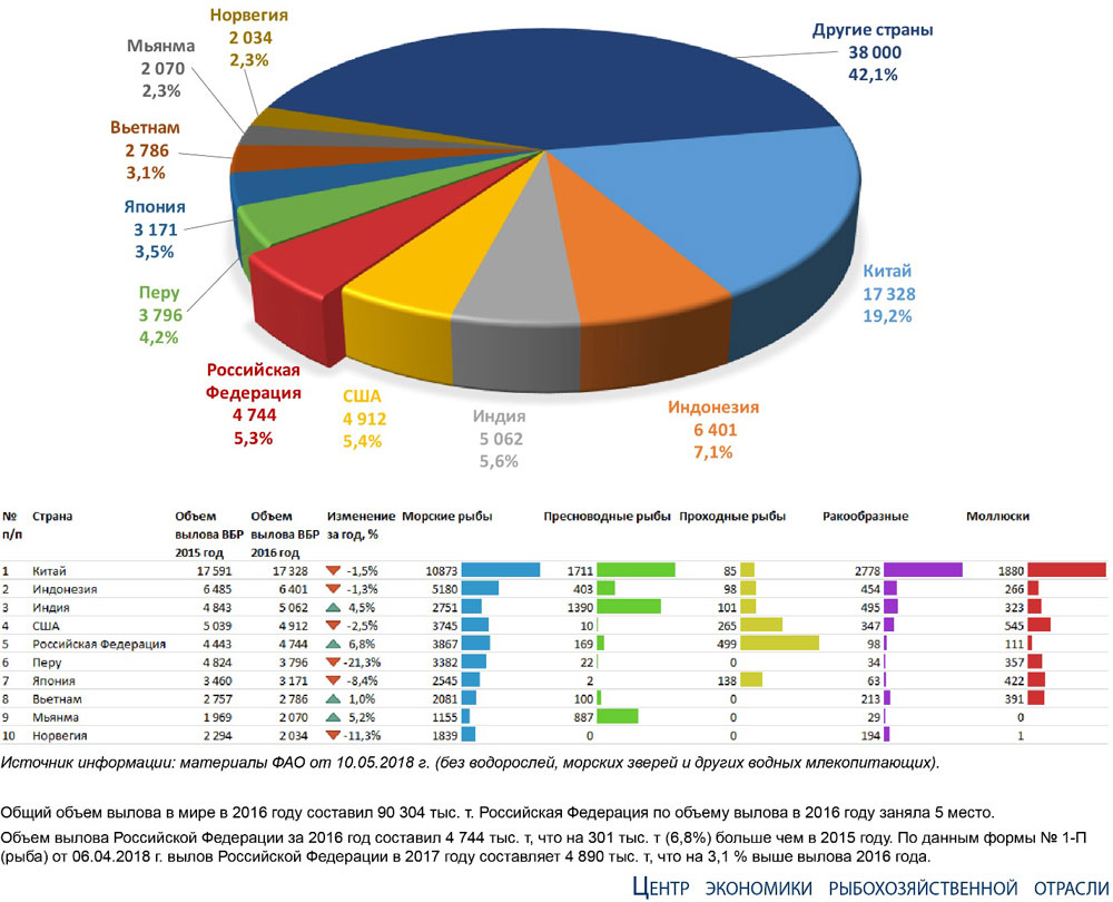 Объем вылова водных биоресурсов 10 ведущих стран мира в 2016 году