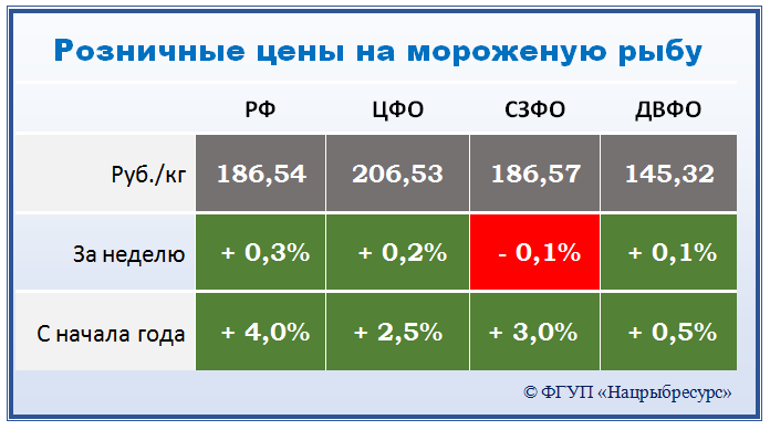 В Центральных регионах под влиянием устойчивого потребительского спроса в период поста, а также колебаний отпускных цен в регионах промысла отмечалось удорожание скумбрии, сельди и минтая. Цены на другие виды мороженой рыбы, в целом, сохраняли стабильность.