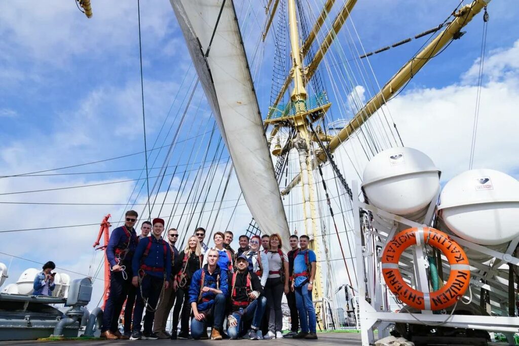 Выпускники программы «Наставничество-2021» проверили лидерские навыки на Балтике в составе команды барка «Крузенштерн»: на борту парусника Росрыболовства 8 августа побывали 14 выпускников из Москвы, Санкт-Петербурга, Ростова-на-Дону, Красноярска, Барнаула, Тулы, Нижний Тагила и Сочи. В день старта обучения этого потока программы в ноябре 2020 г. команда учебного парусного судна «Крузенштерн» подняла флаг клуба Лидеров России «Эльбрус», с которым реализуется программа. В день выпуска молодые лидеры узнали о принципах воспитания специалистов и подготовки капитанов на судах, познакомились с системой наставничества на флоте, сделали тренировочные подъемы на мачту, подняли парус, научались вязать морские узлы.