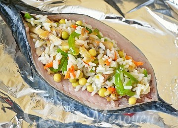 Уложите скумбрию на лист фольги в противне. С помощью ложки наполните рыбу начинкой. Духовка уже должна к этому времени быть разогретой до 180 градусов.