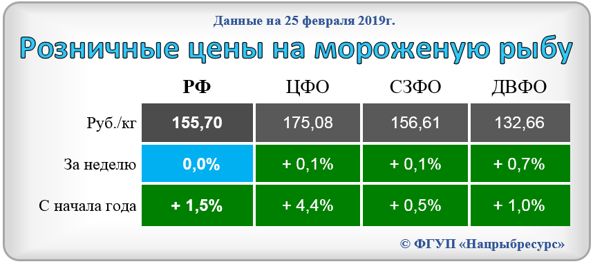Розничные цены стабилизировались. В период с 12 по 18 февраля т.г. средний уровень потребительских цен на рыбу мороженую неразделанную не изменился. В сравнении с началом года цены выросли на 1,5%.