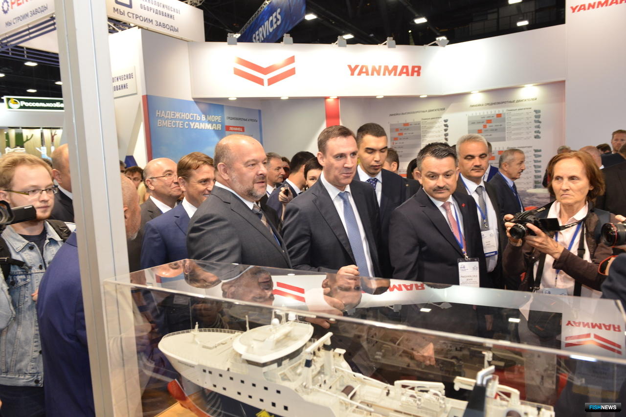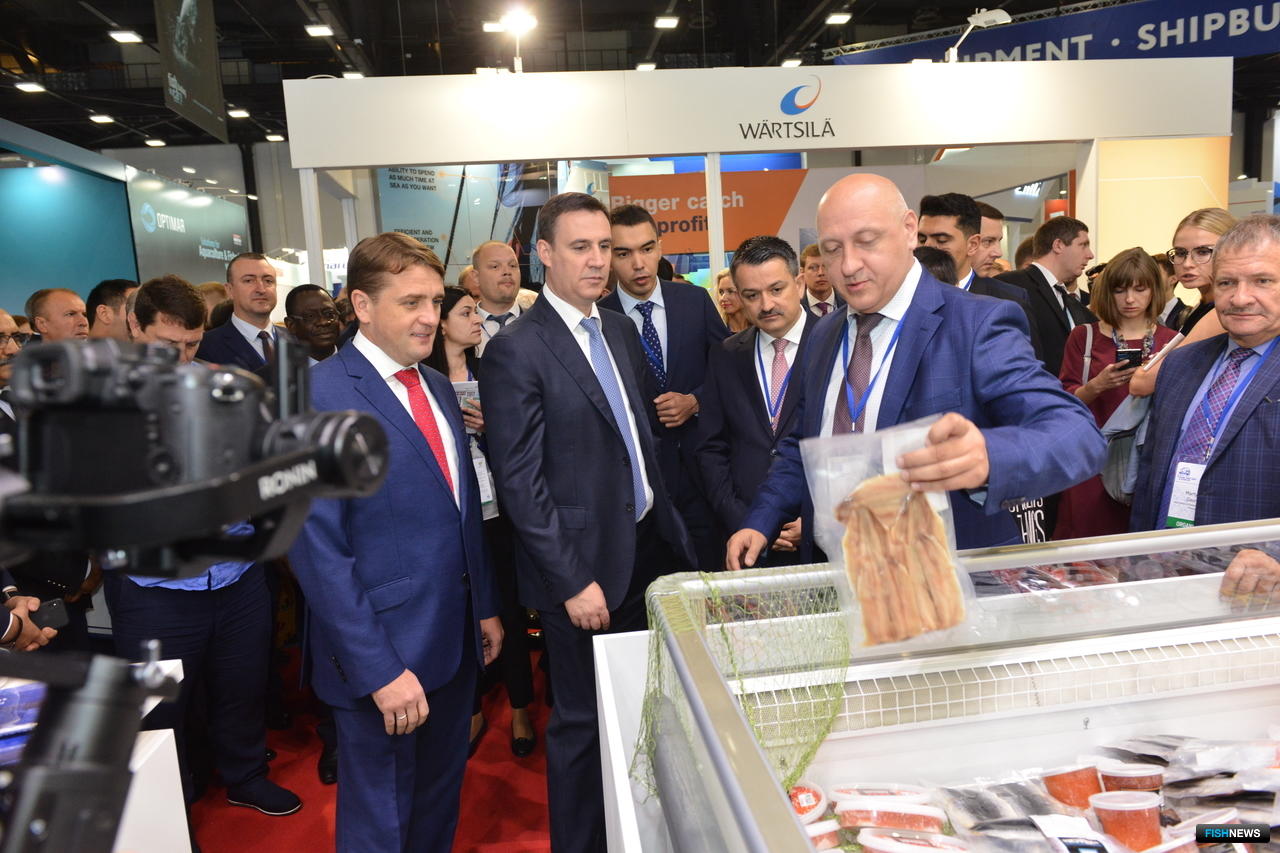 Гендиректор «Русской рыбопромышленной компании» Федор Кирсанов обратил внимание на витрины с образцами филе, фарша и рыбных палочек из минтая, упакованных для розницы. «В прошлом году я вам показывал коробочки, а теперь это продукция, которая продается в «Ленте» и в других сетях», - отчитался он перед руководством профильного ведомства.