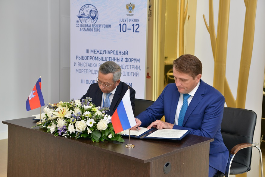 11 июля Федеральное агентство по рыболовству и Министерство сельского, лесного и рыбного хозяйства Королевства Камбоджа подписали меморандум о взаимопонимании по сотрудничеству в области рыбного хозяйства и аквакультуры. Подписи под документом поставили руководитель Росрыболовства Илья Шестаков и делегат от Королевского правительства Камбоджи, генеральный директор администрации рыбного хозяйства Енг Чеасан. Стороны заинтересованы в тесном сотрудничестве в области проведения научных исследований в целях выработки мер, направленных на сохранение морских живых ресурсов и их рациональное использование.