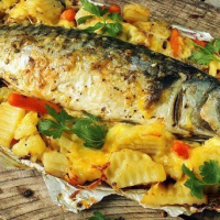 На противень постелить пергамент. Выложить скумбрию кожицей вверх. При температуре 220 градусов нужно запекать 10-15 минут, затем оставить еще на 10 минут для зажаренности. К такой рыбе в качестве гарнира можно подать картофель.