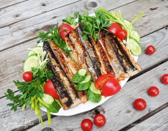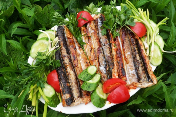 Пикантная скумбрия готова. Подавать немедленно с овощами и зеленью. Приятного аппетита! Угощайтесь!