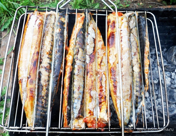 Скумбрия — рыба жирная. Для того чтобы не горел капающий жир, можно посыпать угли горстью крупной соли. Установить решетку на мангал. Готовить около 15 минут (для крупной рыбы), периодически переворачивая решетку.