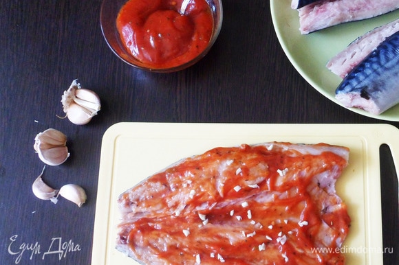 Разрезать рыбу по спинке, удалить центральную кость и черную пленку. Промыть. Для маринада смешать острый томатный соус (у меня кетчуп чили), растительное масло, итальянские травы, соль и черный перец.