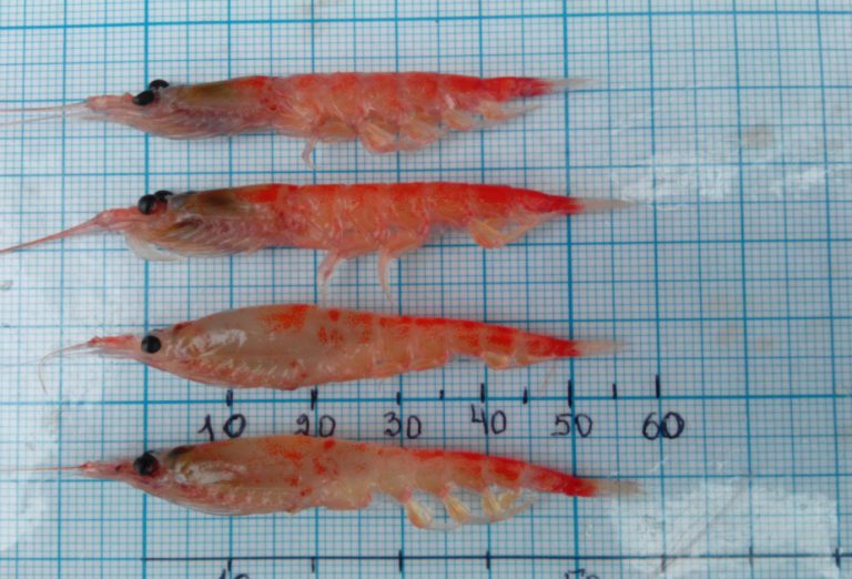 Самцы и самки криля из уловов в феврале 2015 г. у Южных Шетландских остров, — две верхних особи – самцы, нижние – самки. (Фото Н.Н. Жука).