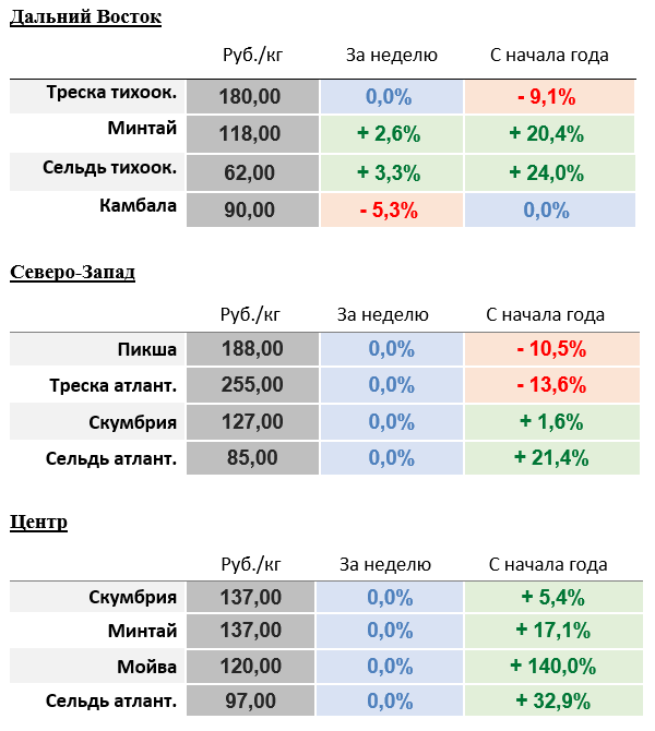 На Северо-западе ценовая ситуация на популярные виды мороженой рыбы была стабильной, находясь под влиянием как сокращения торговой активности со стороны потребителей, так и затоваривания портовых холодильников.