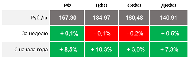 В Дальневосточном регионе активный экспорт способствует удорожанию минтая и сельди, в то же время снижается цена на камбалу что обусловлено положительной динамикой товарных запасов. Цены на другие виды мороженой рыбы были стабильны.
