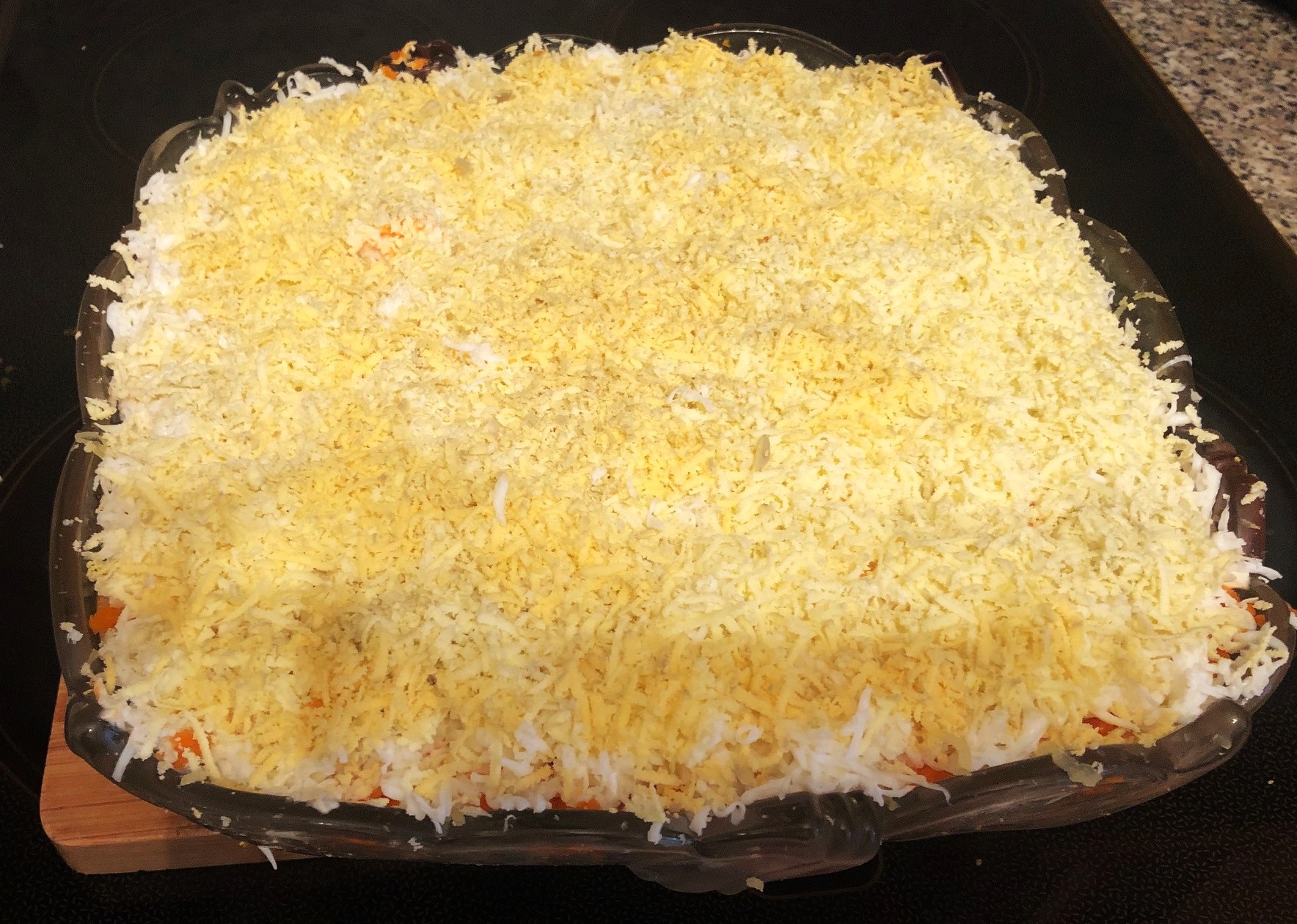 Отделяем желтки от яичных белков. Половину белков натираем на мелкой терке и смазываем майонезом. Повторяем слой рыбы, далее картофель (2 шт.), майонез, морковь (1 шт.), майонез. Последним слоем натираем на мелкой терке оставшиеся белки и поверх них – желтки.